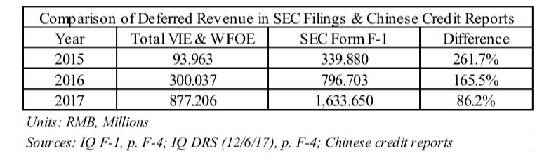 汇总并与爱奇艺的F-1招股说明书相比,我们发现向SEC报告的递延收入在2015年,2016年和2017年分别被高估了261.7%,165.5%和86.2%。