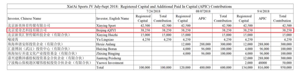新爱公司的股东时间表显示,爱奇艺对合资公司的总出资仅为人民币3,825万元。在随后的两轮融资中,爱奇艺的总贡献没有变化,也没有任何爱奇艺的额外实收资本(“ APIC”)记录。下表中以其子公司之一北京爱奇艺的名义列出了爱奇艺的投资: