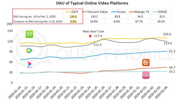 该报告显示,爱奇艺的平均移动DAU在2020年春节的前10天仅为1.262亿,而爱奇艺声称的平均移动DAU为1.8亿。此外,QuestMobile报告显示,爱奇艺的DAU在2019年至2020年中国农历新年期间没有增长: