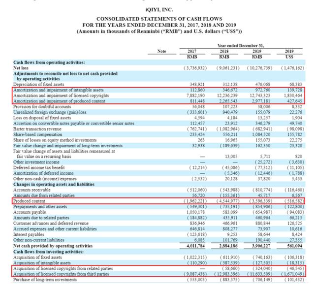 爱奇艺在其现金流量表中报告了与内容相关的三个项目:许可版权的摊销,(自身)生产内容的摊销和减损以及许可版权的减损。作为摊销费用,每笔费用都为OCF做出了积极贡献。在“经营资产和负债的变化”下,列出了(自)生产内容的现金流出。将这些与其他项目组合在一起以创建总OCF。爱奇艺的最大现金支出,即“获取许可版权”,在“投资活动的现金流量”下进一步记录。通过消除从OCF获得许可的版权中获得的现金流出并将其记录在投资的现金流量中,爱奇艺的OCF看起来是积极的: