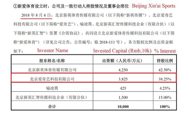 下面的摘录和表格显示了公司成立时的股东及其各自的股份。红色框为北京爱奇艺科技有限公司,其出资额为3825万元人民币,最初占38.25%的股份。