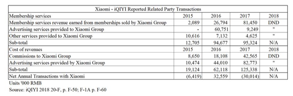 据报道,截至2017年底,小米已成为关联方,爱奇艺-Xiaomi交易的详细信息已在爱奇艺的招股说明书中列出。尽管小米继续将爱奇艺披露为关联方,但爱奇艺却没有这样做。下表摘自爱奇艺的2018 20-F,显示了这些历史交易: