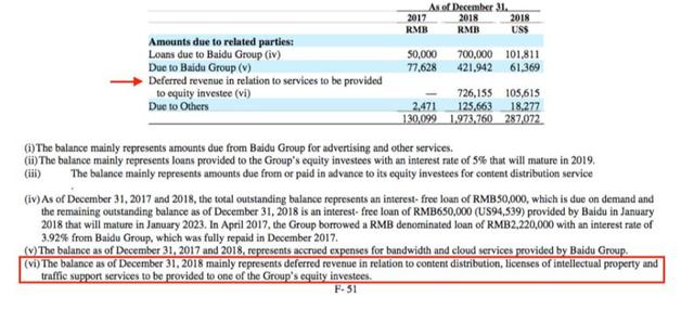 爱奇艺只是夸大了其投资,声称以“要交付的内容”的形式提供了额外的非现金出资,爱奇艺价值约为7.775亿元人民币(1.1021亿美元)。截至2018年12月31日,该非现金出资在爱奇艺的账簿上记为“与提供给关联方的服务相关的递延收入”人民币7.262亿元。