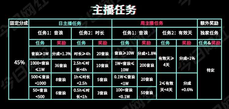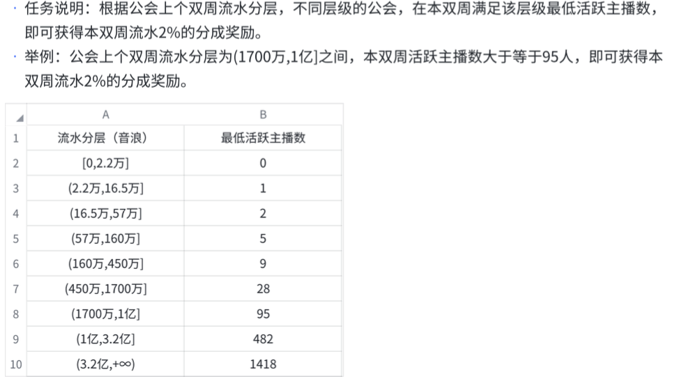 同理,活跃任务的分成比例也跟流水任务类似。按照不同的流水体量将公会划分为不同等级,然后根据不同等级的公会在活跃主播数量以及流水上增长服务来决定分成比例。