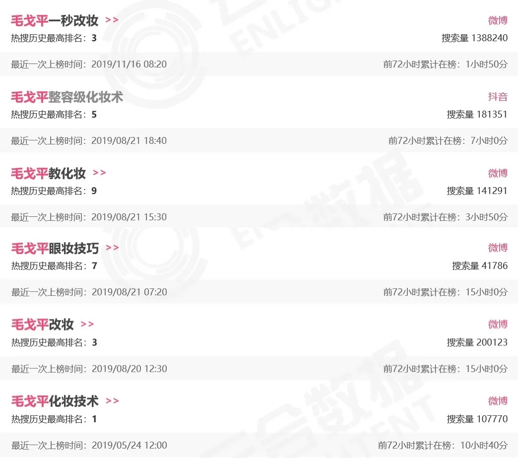 2019年至今,毛戈平本人共登上6次微博热搜。2019年8月20日,毛戈平为博主@深夜徐老师的改妆视频最高登上微博热搜榜第3,话题拥有7亿阅读、40w讨论,并引发网友对毛戈平化妆技术的考古,8月21日又有三个不同的相关话题登上热搜。