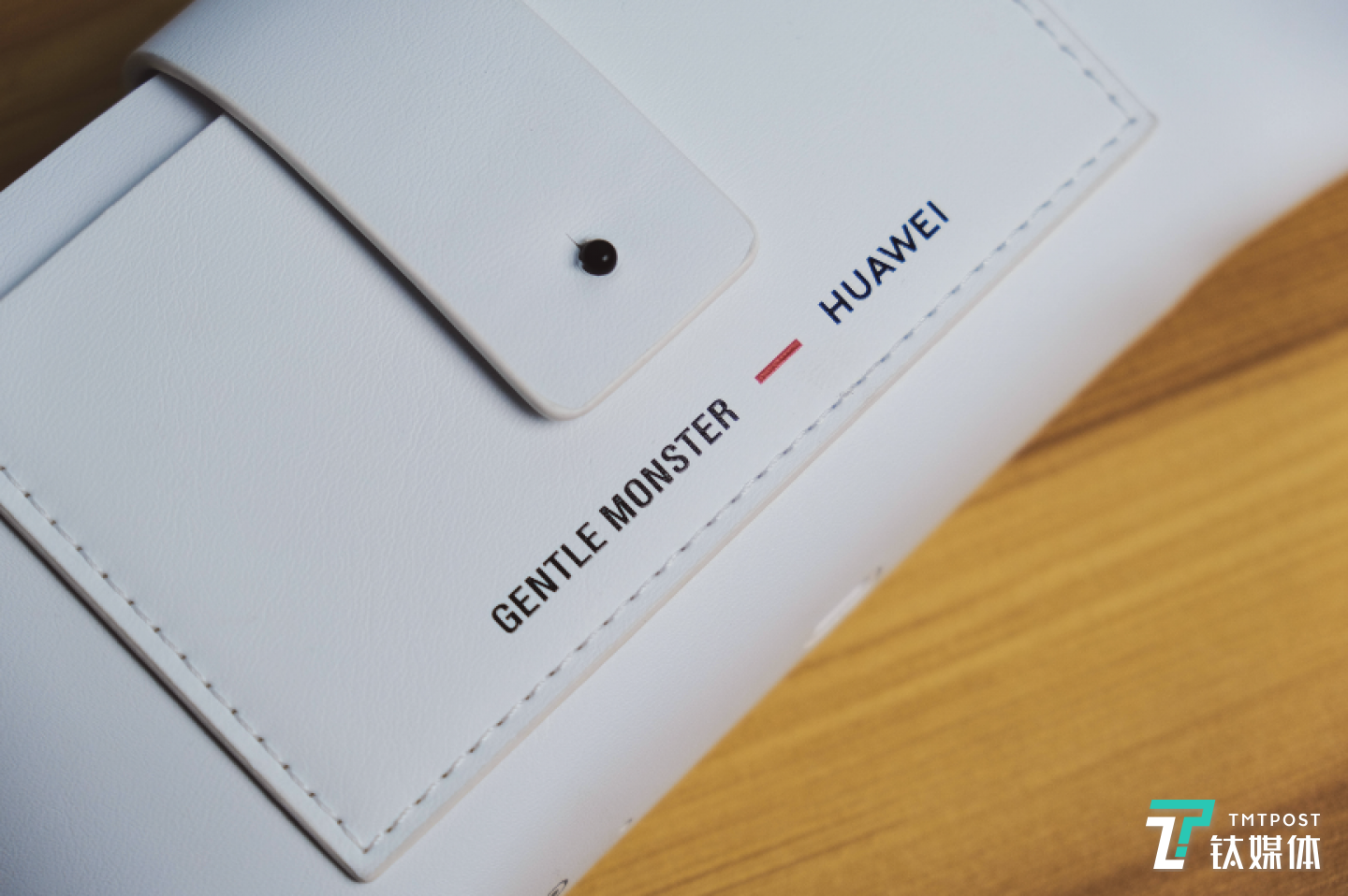 除了墨镜本体之外,产品还附赠了白色皮质眼镜盒。在眼镜盒外部有一个用来收纳擦镜布的小兜,上面印有“GENTLE MONSTER-华为”的LOGO。底部则是一个USB-C充电口、电源/配对按钮以及状态指示灯。