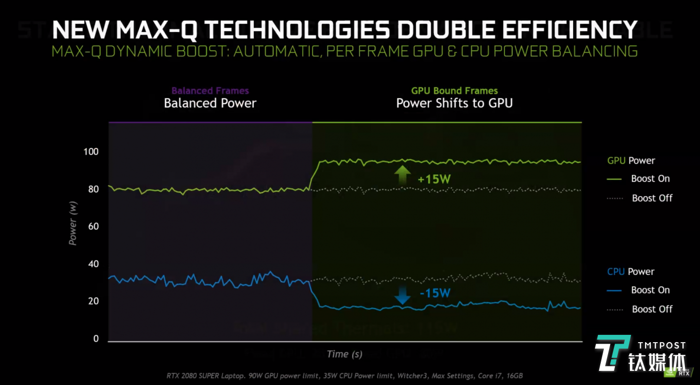 Dynamic Boost — 在每一帧画面上,智能自动调节GPU和CPU之间的功耗分配,从而提高整体游戏性能。Dynamic Boost可以自动运行并动态调节,在不增加系统功耗的前提下提供更高性能。