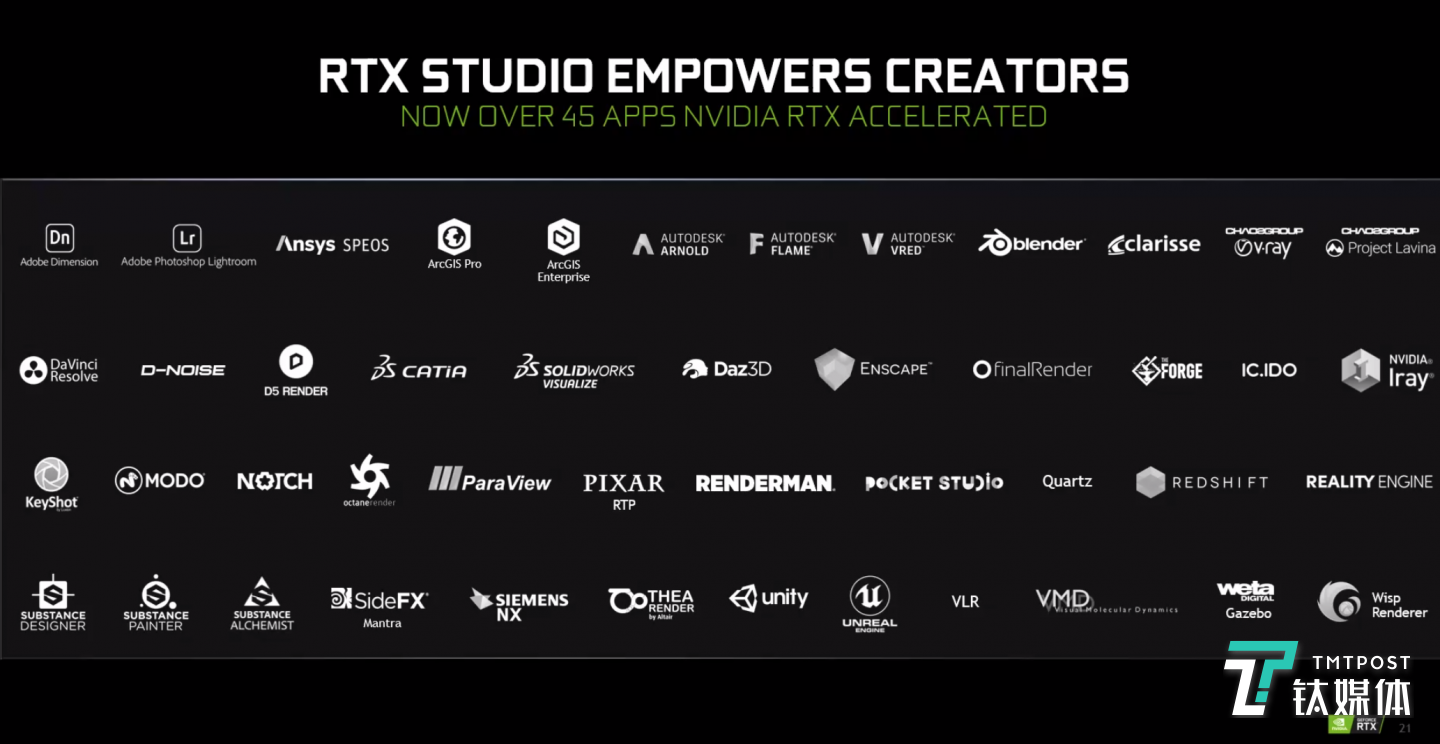 包括Adobe Premiere Pro,DaVinci Resolve,AutoDesk Arnold,Blender等超过45种顶级创作软件已支持RTX acceleration。