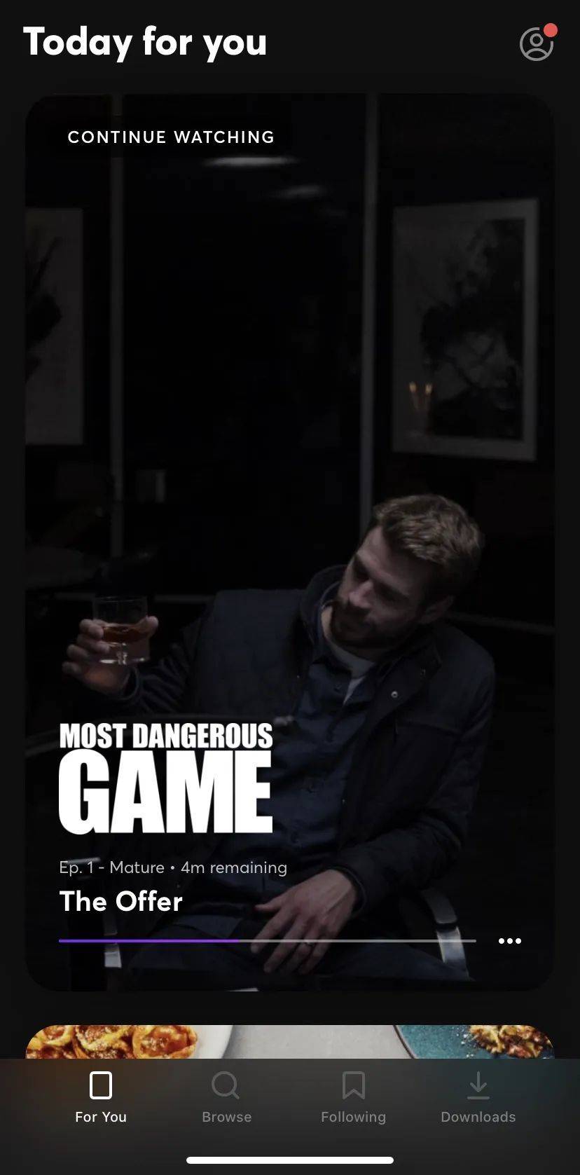 但是一旦进入APP,便可发现它那藏在流媒体平台表皮下的短视频基因。因为APP首页展示的是由算法推荐的Today for you版块,每个节目和剧集以头图的方式作为呈现,只要像使用Tik Tok那样用手指向上或下滑动,就可以任意切换视频。一旦点击,便可以开始观看该视频。