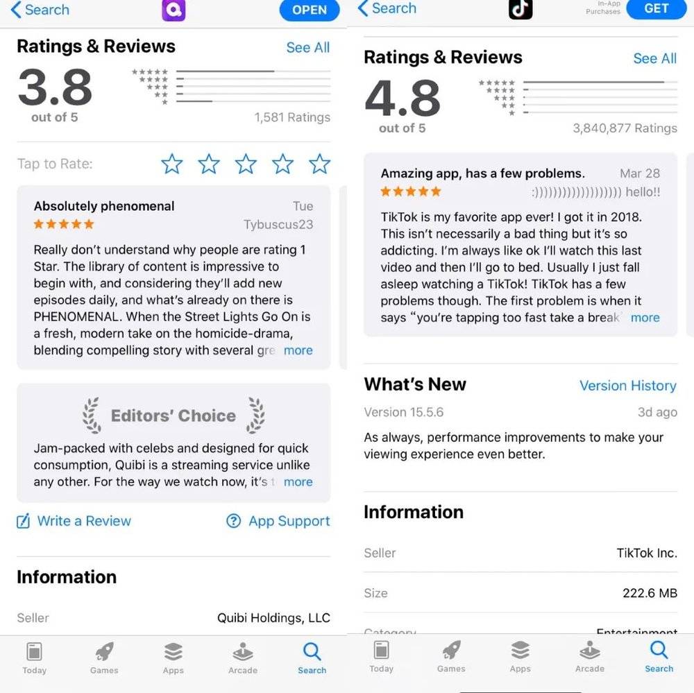 从App Store的下载页信息看来,目前Quibi的评分仅有3.8分,且评论人数仅有1581名。相较之下,Tik Tok的表现则要好很多,目前Tik Tok的评分为4.8分,且有约384万人参与评论。