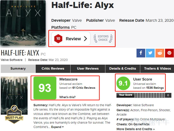 在游戏风评方面,一向苛刻的Metacritic给出了93分,玩家同样给出了9.1的高分,知名游戏网站IGN更是直接给它打了满分10分,认为这是一款来自未来的游戏,其他VR作品要想赶上Alyx恐怕要花非常久的时间,更别提超越它了。