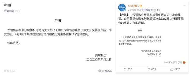 钛媒体快讯 | 4月10日消息:中兴通讯回应高管鲍毓明性侵养女一事,称获悉报道后高度重视,“董事会已收到鲍毓明辞去独立非执行董事职务的申请”。此前,鲍毓明任副总裁兼首席法务官的杰瑞集团亦表示,已经与鲍毓明协商解除劳动合同。
