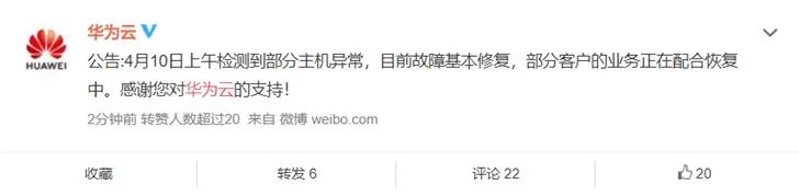 钛媒体快讯 | 4月10日消息:今日上午,多位微博用户称华为云出现登录异常、管理后台无法访问等情况。过了大概两个小时,华为云官方微博回应称,4月10日上午检测到部分主机异常,目前故障基本修复,部分客户的业务正在配合恢复中。