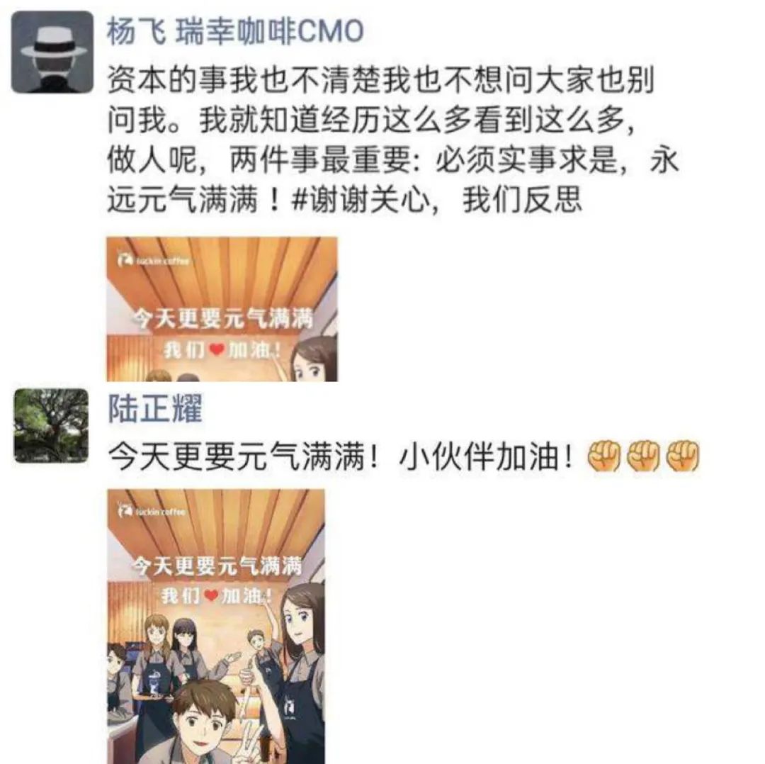 “自爆”之后,瑞幸CMO杨飞发了一条朋友圈,表示自己并不知情,“资本的事我不清楚也不想问大家也别问我“,并配了一张“元气满满“的图,和董事长陆正耀的朋友圈遥相呼应。