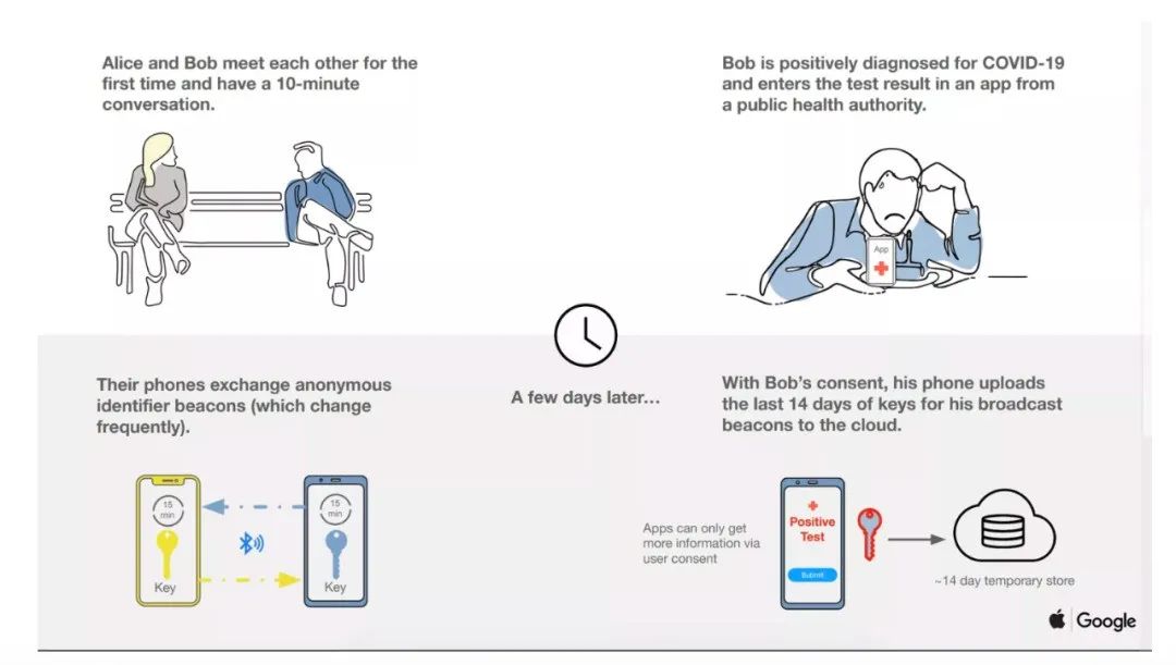 爱丽丝和鲍勃首次见面,交谈了10分钟。在这个过程中,他们的手机交换、储存了彼此的匿名身份密钥。此后鲍勃不幸确诊感染新冠病毒,他把自己的诊断结果上传到了公共医疗卫生部门的手机应用数据库中。在鲍勃的同意之下,他的手机将最近14天使用的身份密钥上传到云端。