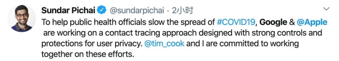当地时间4月10日,苹果CEO库克与谷歌CEO皮猜在推特上互相@,宣布两家公司将合作打通苹果与安卓手机系统,推出追踪新冠患者接触者的手机基础功能。