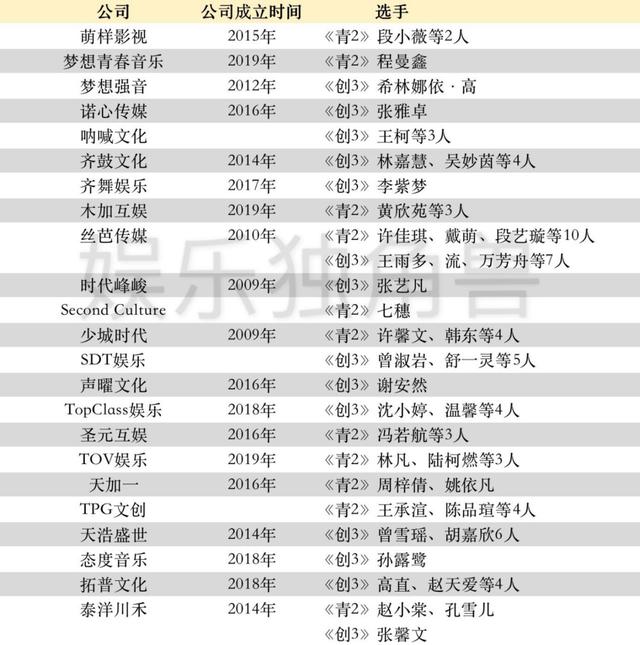 据《青春有你2》《创造营2020》公开信息不难发现,今年入局两档女团节目者可谓老玩家与新面孔皆有。其中有诸如乐华娱乐、香蕉娱乐、觉醒东方、齐鼓文化等在业内具有较高知名度的经纪公司,也有诸如丝芭传媒、时代峰峻、嘉行新悦、好好榜样等被风口吸引而来的前进者,也有只参加一档节目的“站队”者。