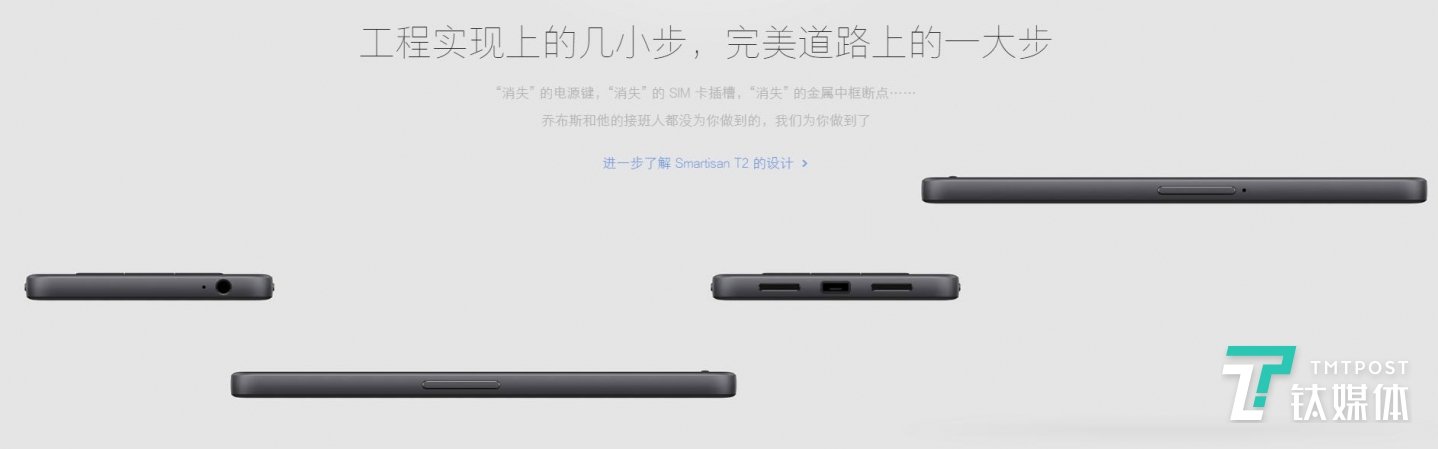 这种兼顾左右手用户的设计理念,与此前老罗在做锤子手机时候的“全对称式设计”不谋而合——锤子手机T系列产品左右都有实体按键,用户可以自定义哪一边是音量调节,哪一边是亮度调节。