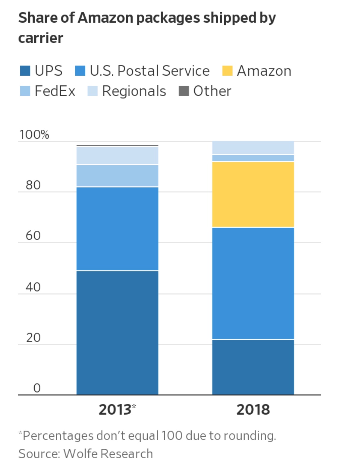 上图显示了这些年是谁在配送亚马逊的包裹。2018年时,亚马逊自建配送已经承担了该平台26%的配送服务,挤占的是UPS、FedEx的份额。据摩根斯坦利最新预测,这一占比现在已经达到一半左右。几个月前,FedEx终止了与亚马逊的合同,不过亚马逊和FedEx彼此依赖度都比较低,均不是对方的最大客户。