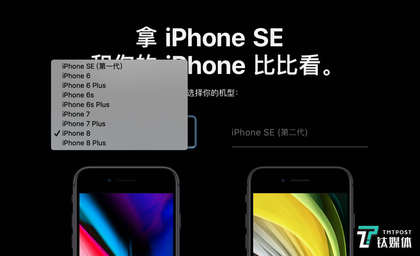 钛媒体从苹果官网iPhone SE的详情页发现,苹果提供给用户在网站打浏览选项当中,增加了与iPhone SE的对比机型,这些机型除了情理之中的 iPhone SE (第一代),还有iPhone 6、iPhone 7、iPhone 8三个系列的产品。
