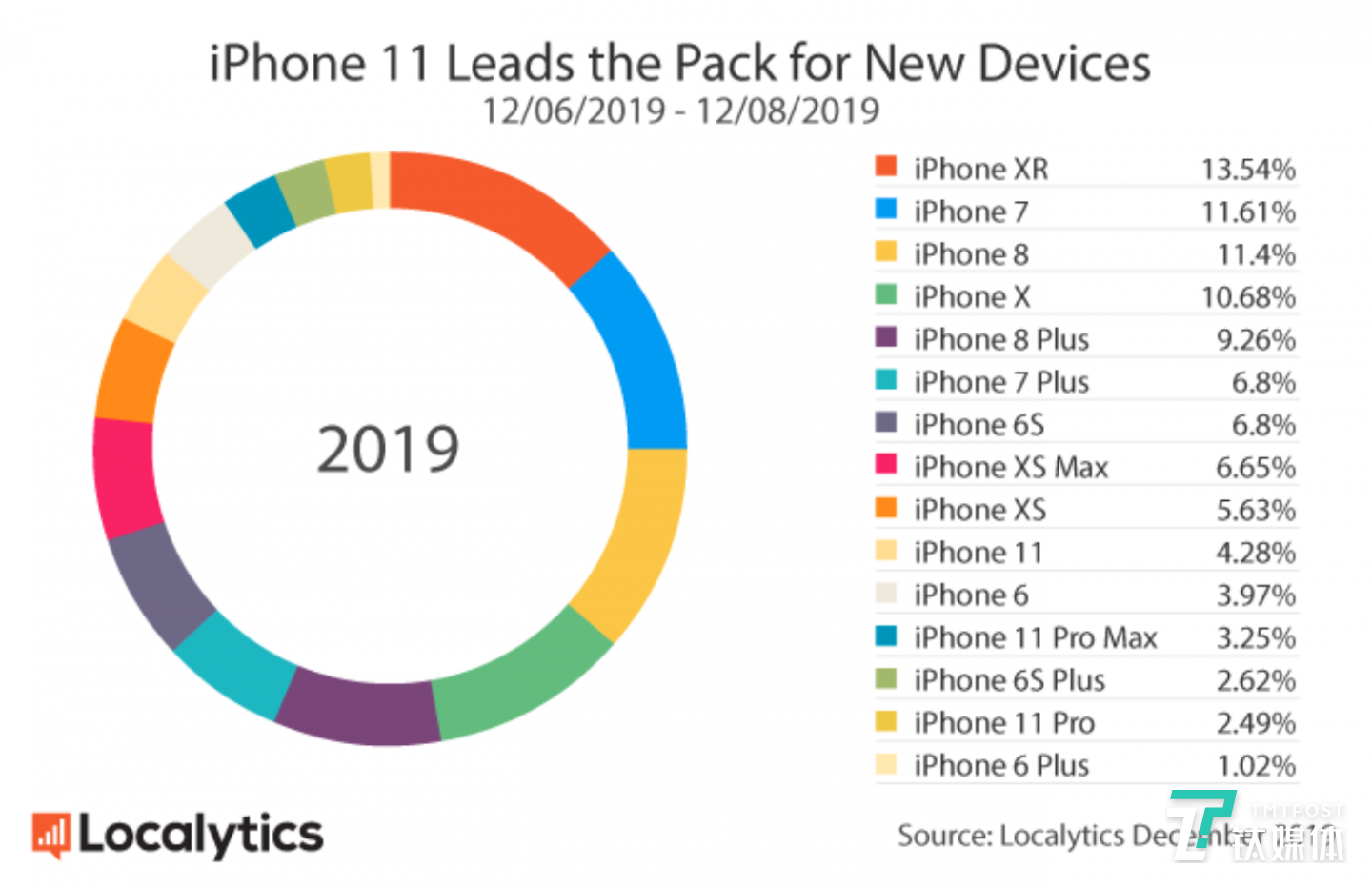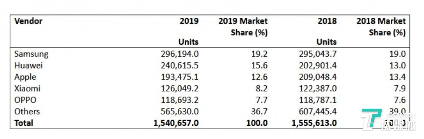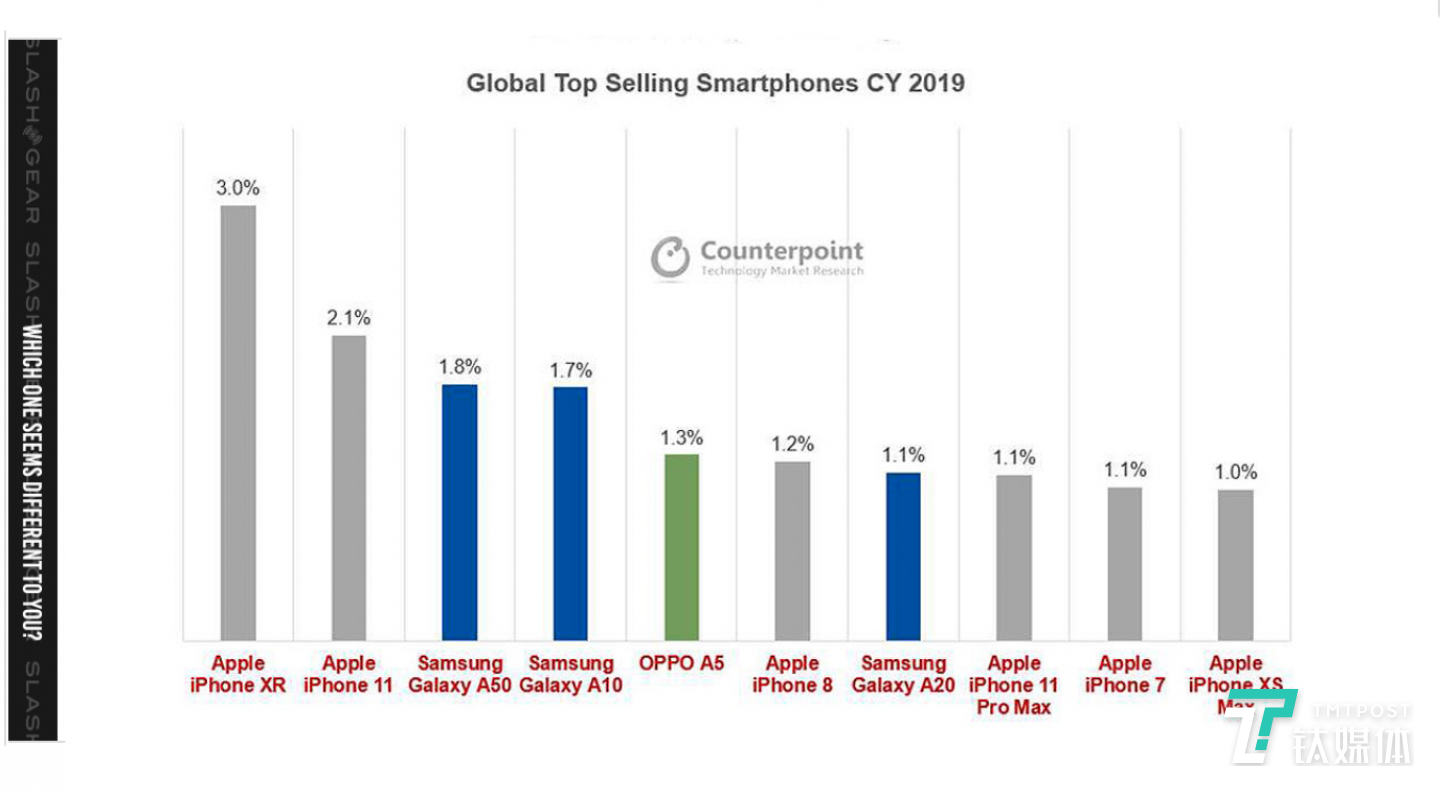 我们再来看看另外一家数据分析机构 Counterpoint 的一份报告,不是品牌排名,而是关于2019年的单机型销量排行,前十名当中苹果占据了5席,国产手机只有1款上榜,另外4款当中有3款是三星的Galaxy A系列。