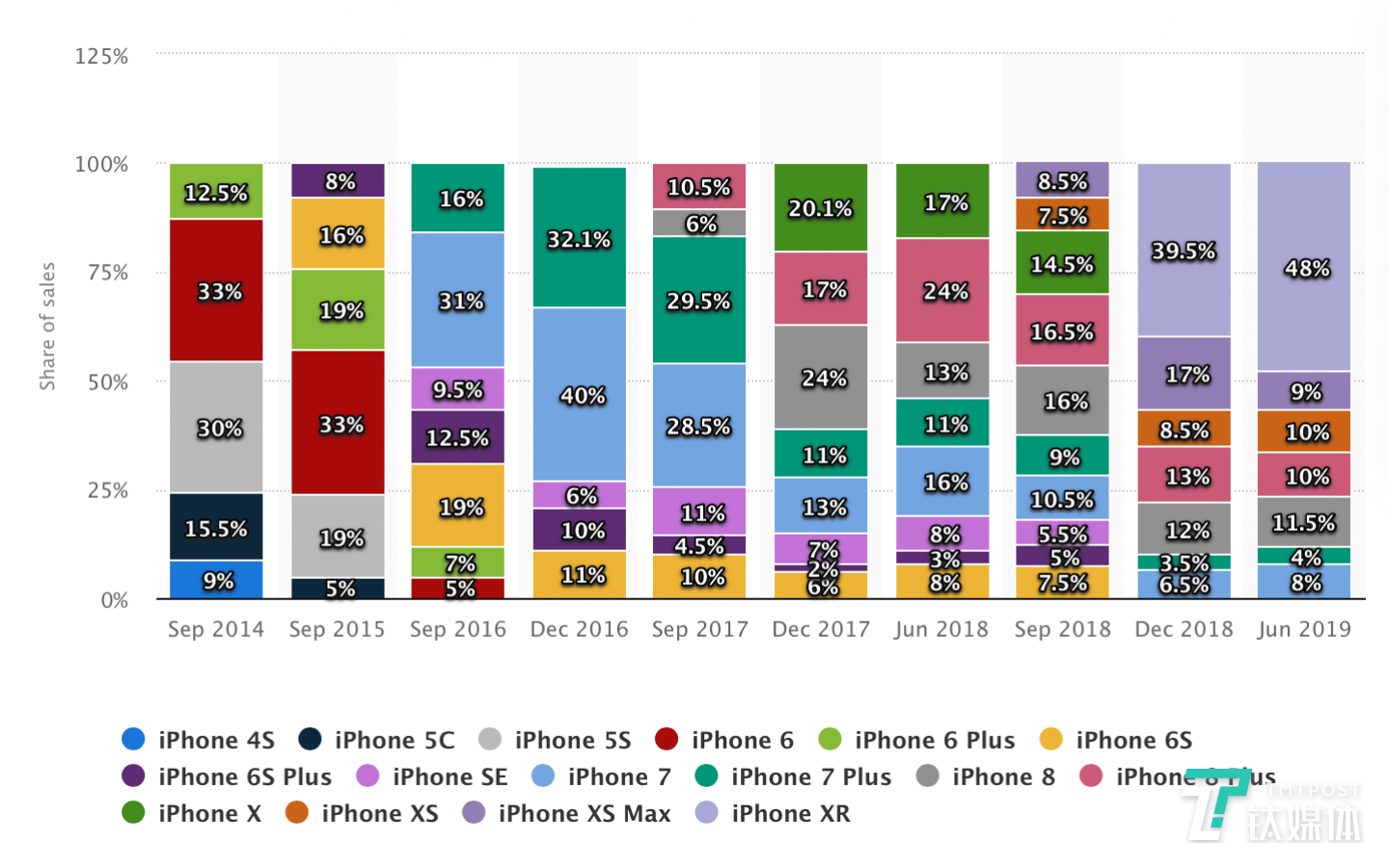 我们再来看另外一家数据统计网站 Statista 的一份报告,它统计了2014-2019年iPhone在美国的销量情况,可以直观地发现占比例最高的通常不是旗舰产品,即便是在苹果总部所在地的美国,仍在使用iPhone 8代以及更早机器的用户同样也不少。