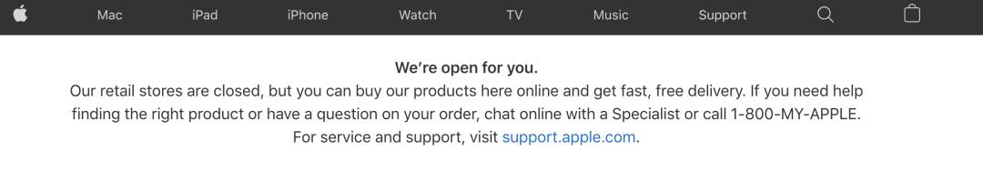 三月中旬,库克发布公开信,表示因为病毒缘故,将暂时关闭大中华区以外的所有苹果零售店,此次暂时闭店措施将持续至3月27日。但实际上,直到目前苹果在海外的大多数门店仍然处于关闭状态,在苹果官网上也给出了建议消费者上网订购的公告。