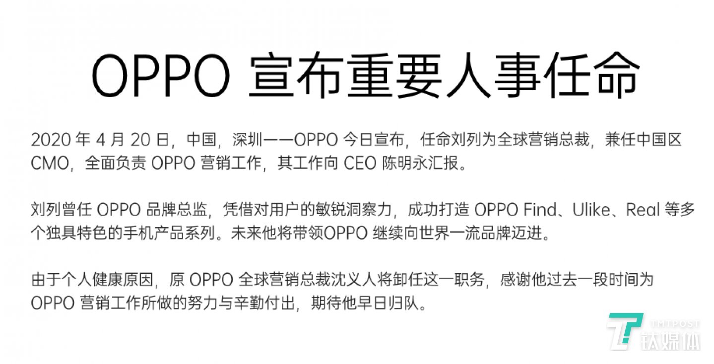 钛媒体快讯 | 4月20日消息:刚刚,OPPO官方发布了最新的人事变动声明,正式宣布任命刘列为全球营销总裁,兼任中国区CMO,全面负责OPPO营销工作,其工作向CEO陈明永汇报,沈义人卸任OPPO全球营销总裁。