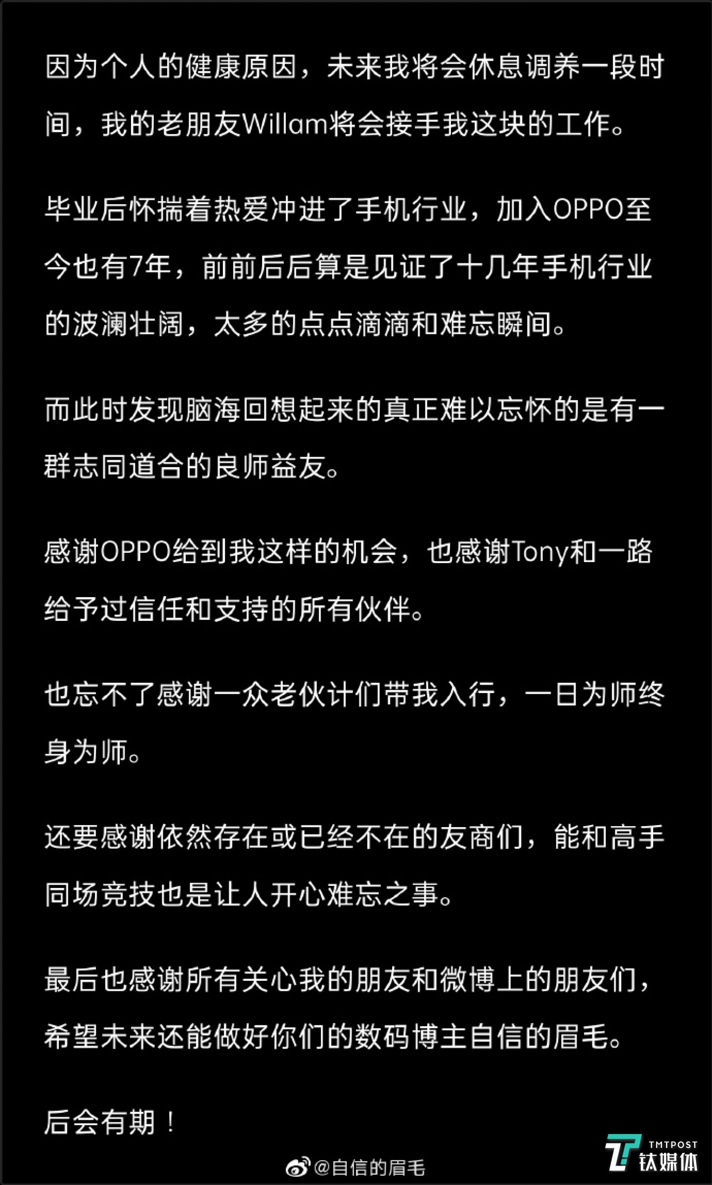 随后,沈义人也在自己的个人微博账号上发布长文告别。沈义人表示,感谢OPPO给自己的机会,也感谢Tony和一路给予信任和支持的所有伙伴,也忘不了感谢一众老伙计们带自己入行,一日为师终身为师,还要感谢依然存在或已经不在的友商们,能和高手同场竞技也是让人开心难忘之事。