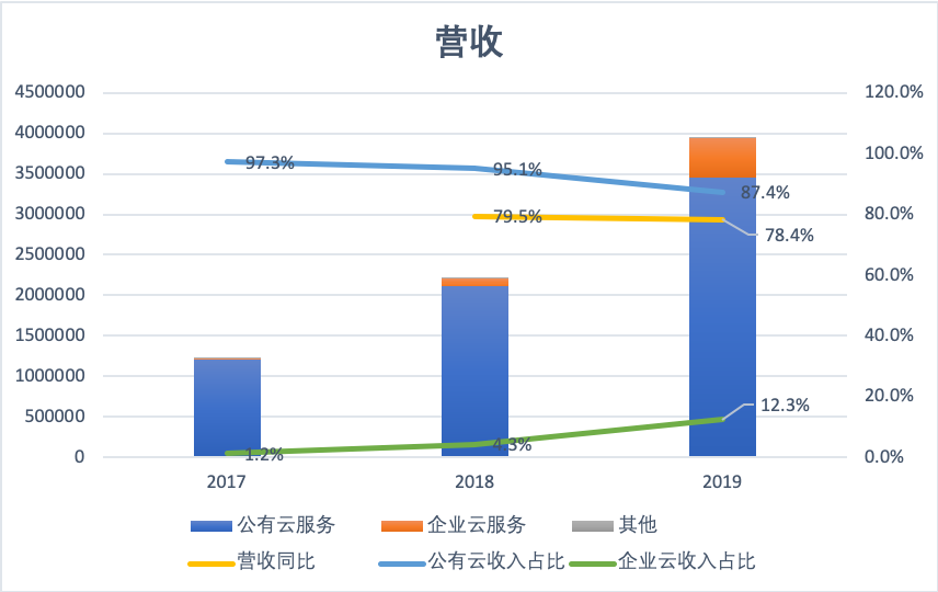 先来看营收结构,金山云的主要营收来源为公有云服务。2017年,2018年和2019年,公有云服务的收入占比从97.3%、95.1%逐渐降低到87.4%,但依然是绝对的营收主力。而相应的是企业云服务,其收入占比从1.2%、4.3%大幅提升至12.3%。