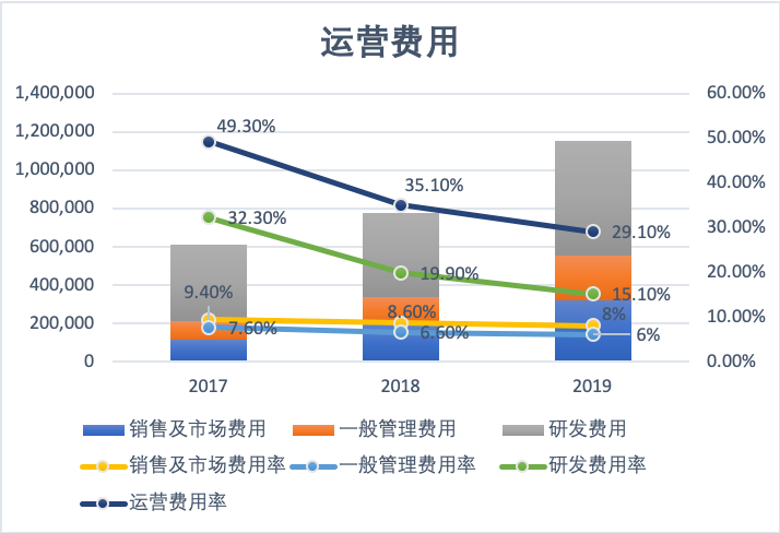金山云的运营费用率也在不断降低,2017年~2019年间,运营费用率从49.30%、35.10%降低至29.10%,这主要归功于研发费用的不断降低。研发费用在整体运营费用中一直占大头,研发费用率2017年~2019年间分别为21.30%、19.90%和15.10%。