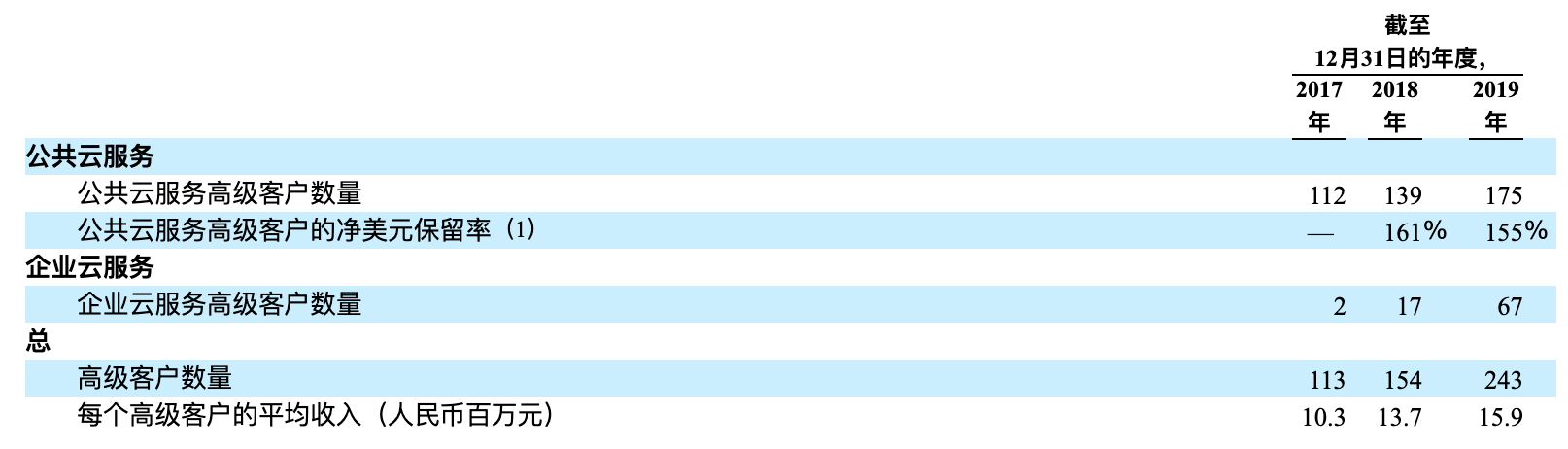 在2019年,金山云高级客户数量为243个,相比2018年增长了89个,每个高级客户的平均收入为1590万元。其中:公有云服务高级客户数量为175个,相比2018年增长了36个;企业云服务高级客户数量为67个,相比2018年增长了50个。
