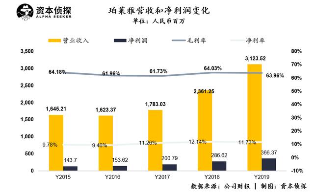 得益于营销、产线、研发、渠道四管齐下,珀莱雅近年来实现了营收和利润的同步增长,净利率和毛利率都维持在了一个比较稳定的水平。