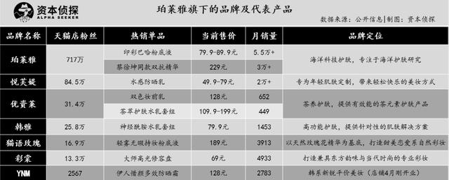 珀莱雅创立于2003年,是国内集研发、生产、销售为一体的大型化妆品集团,旗下拥有珀莱雅、优资莱、悦芙媞、韩雅、猫语玫瑰、YNM、彩棠等7个品牌共千余种产品,其中,Proya珀莱雅为知名度最高的品牌。