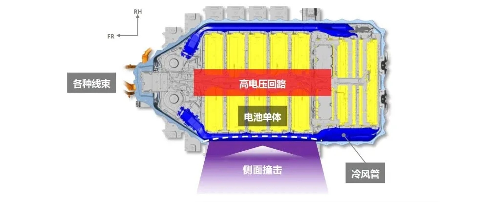 (1)通过将高电压回路设置在电池包中央,并用冷风管把电池包内部包围起来的构造形成缓冲区来保护电池单体和高压回路。