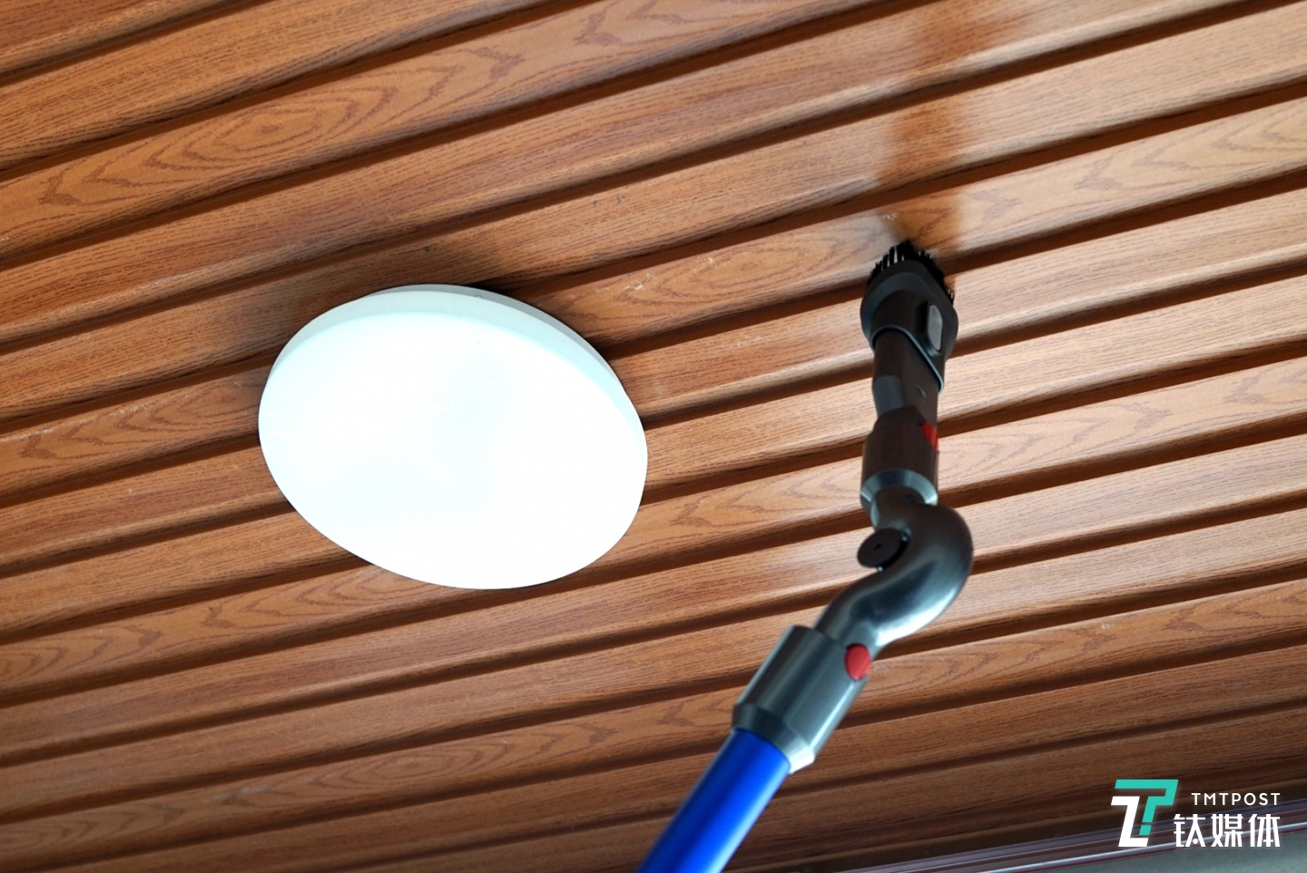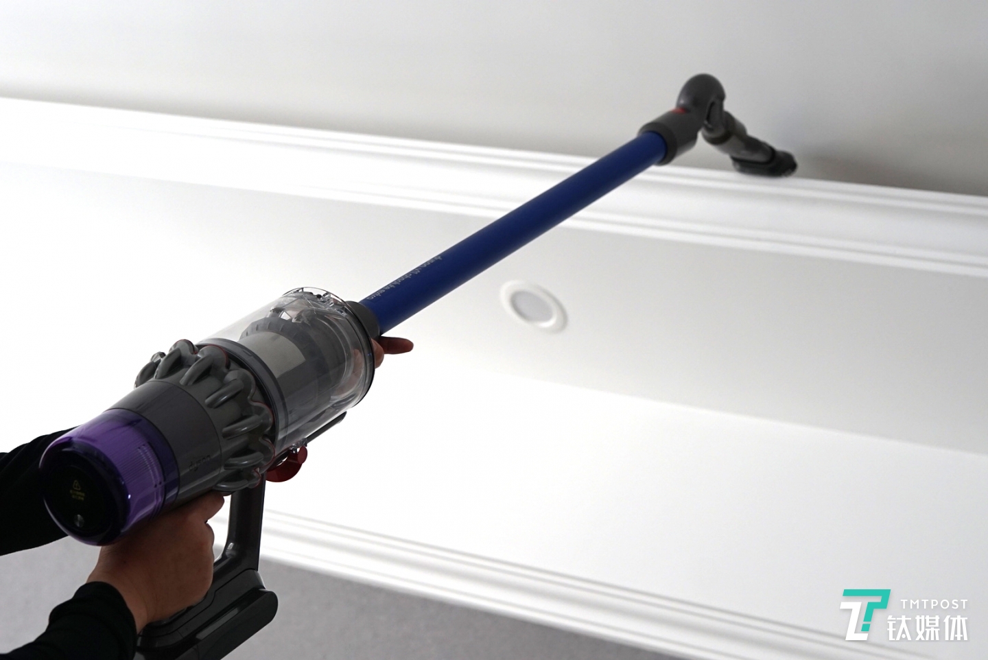 戴森V11 Absolute Extra 的配件列表当中,有一个专门适用于此场景的高处转换头,既延长了吸尘杆的长度,又让清洁的角度可以随意变换。