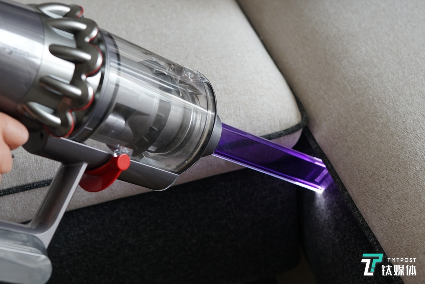 我们以本次V11 Absolute Extra 新增的窄缝照明吸头为例,这个配件顾名思义,就是为昏暗的场景量身定做的,当你开启机器,窄缝照明吸头的前部会有一个LED灯光,非常实用。