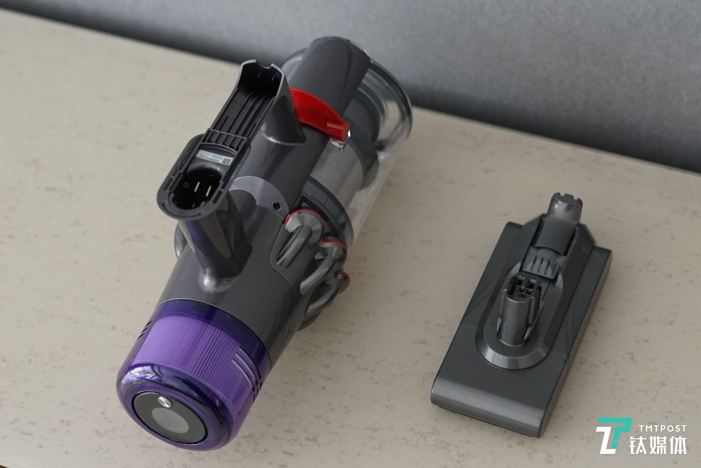 主机结构上,可替换电池的设计是新品最大的亮点。通过一个非标准化的接口,V11 Absolute Extra 底部的电池可以非常便捷的拆卸下来进行单独充电。
