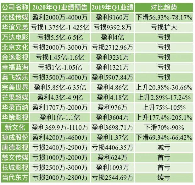 4月中旬,各类影视公司纷纷发布Q1业绩预告。据不完全统计,截止写稿时间,一共17家影视公司发布业绩预告,数据里分野迅速出现:光线传媒、北京文化、华谊兄弟等传统电影巨头业绩下滑或亏损,完美影视、芒果超媒、华录百纳、华策影视等传统影视巨头却预计业绩上升。