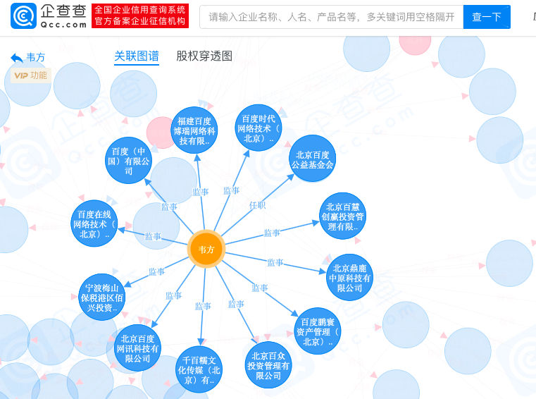 4月21日,天眼查提供的数据则显示,韦方在包括北京百慧创赢投资管理有限公司、北京百众投资管理有限公司、百度(中国)有限公司等在内的15家百度相关企业担任监事等职务。此外,共有两条股权出质信息,质权人均为北京小度信息科技有限公司,出质股权数额198万元。![]()