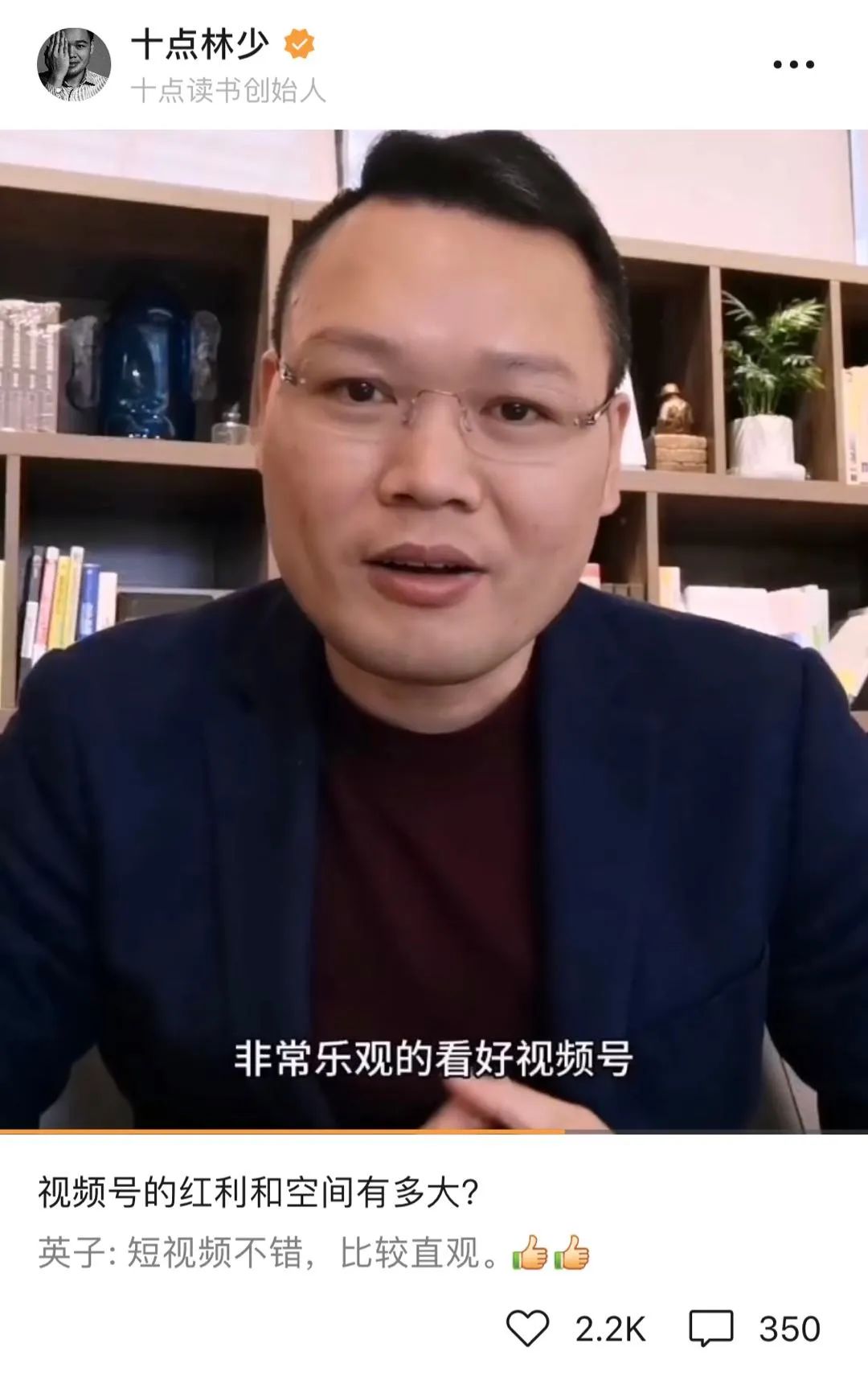 十点读书创始人林少说:“自媒体行业有很多老互联网人、科技达人,他们可能以前做公众号、做博客都不错,但抖音快手却没做起来,其实有很多原因,可能有些自媒体大叔本身就不适合那些平台的生态…但我们最近玩视频号都挺起劲的。”