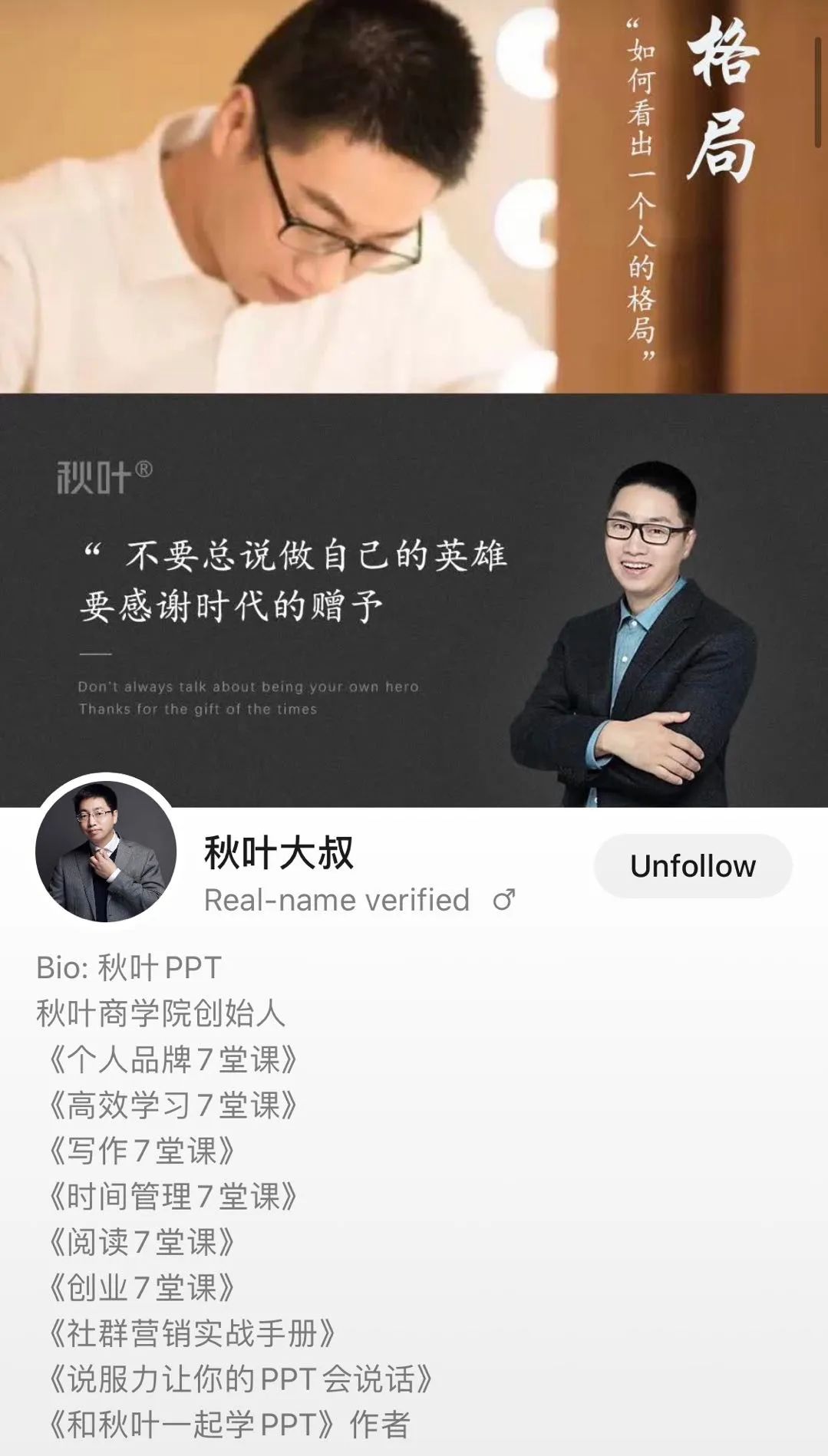 跟林少和徐志斌不同,现阶段秋叶大叔视频号中真人出镜非常有限,大多是PPT+配音。