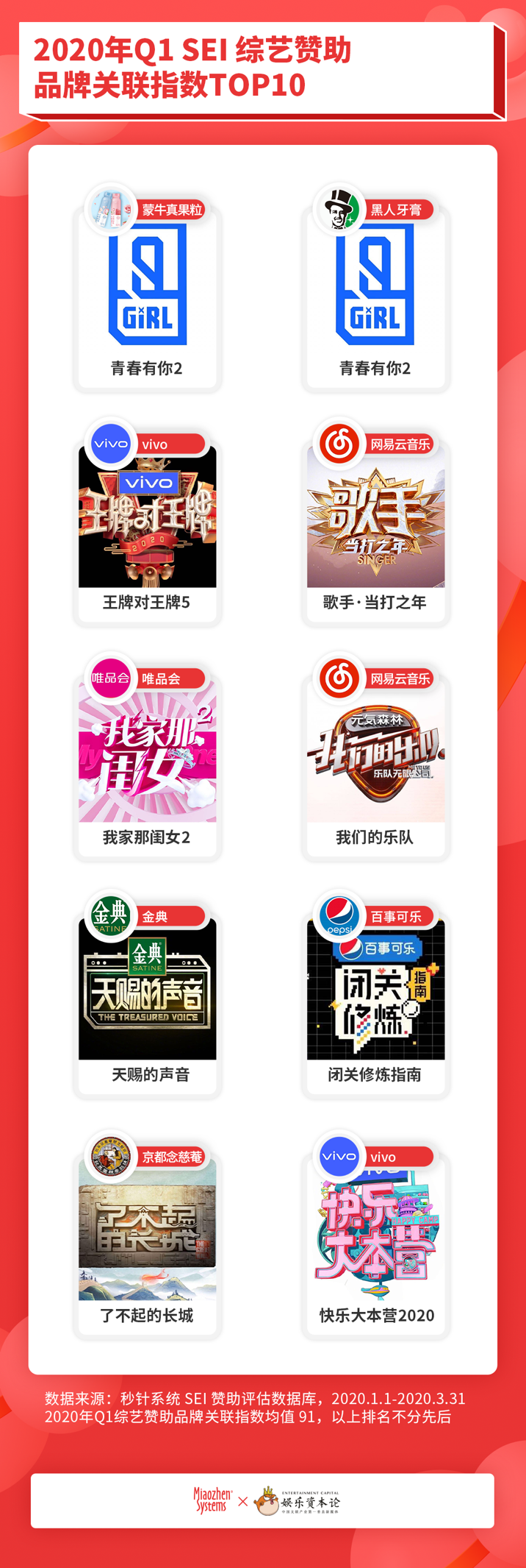 根据娱乐资本论和秒针系统联合推出的2020年Q1综艺赞助品牌关联指数榜单中,可发现偶像节目为品牌带来的关联度最为突出,而受众年龄广的卫视综N代,其对品牌的印象度赋能也在新综艺之上。