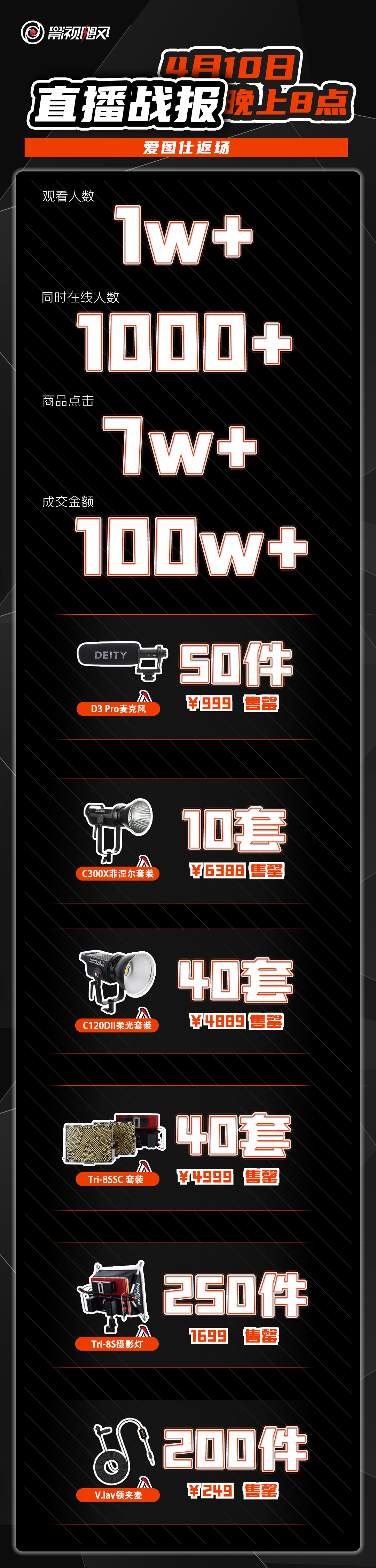 在Tim团队的主动出击下,3月4日,他们与数码品牌爱图仕达成合作,这是第一个品牌专场。在直播战绩上,Tim有了很大提升。3月4日第一场为爱图仕的带货直播,销售额是30万,到了4月10日的爱图仕返场,销售额已经超过100万。