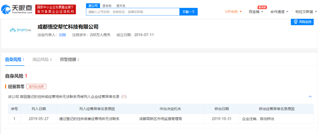 天眼查数据显示,成都悟空帮忙科技有限公司成立于2016年,2019年10月31日,该公司被注销。