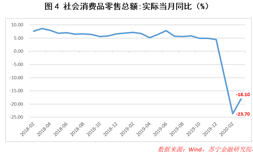 四是疫情使人们减少了消费,并唤醒了居民的危机意识,在投资、消费、储蓄的选择中,将更多的资金倾向于储蓄,以更好的应对未来的不确定性,代表居民消费的社会消费品零售总额大幅下跌(见图4)。