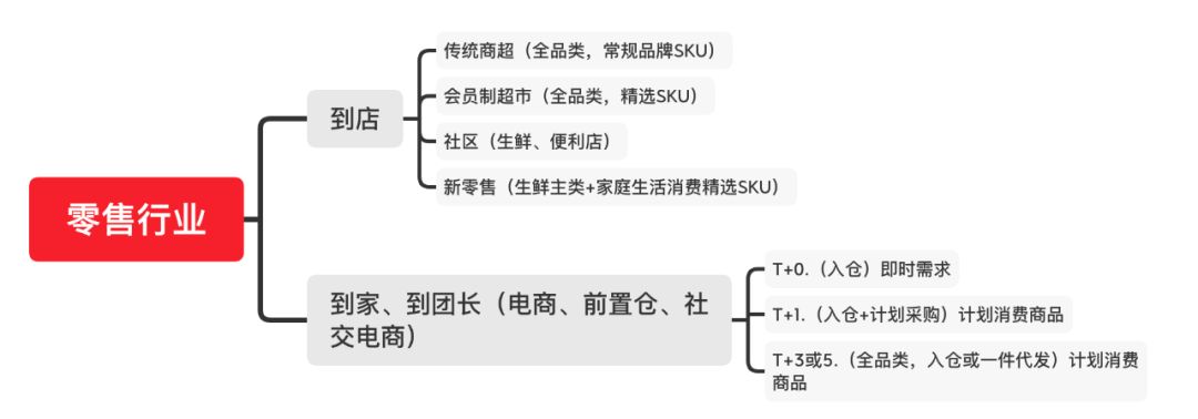 其中到店就是传统商超、会员制超市、社区生鲜便利,以及新零售等业态。