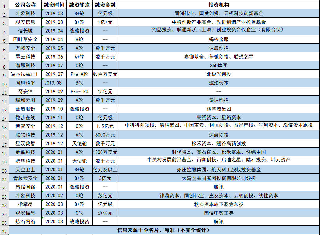 2019年至今,信息安全行业融资情况