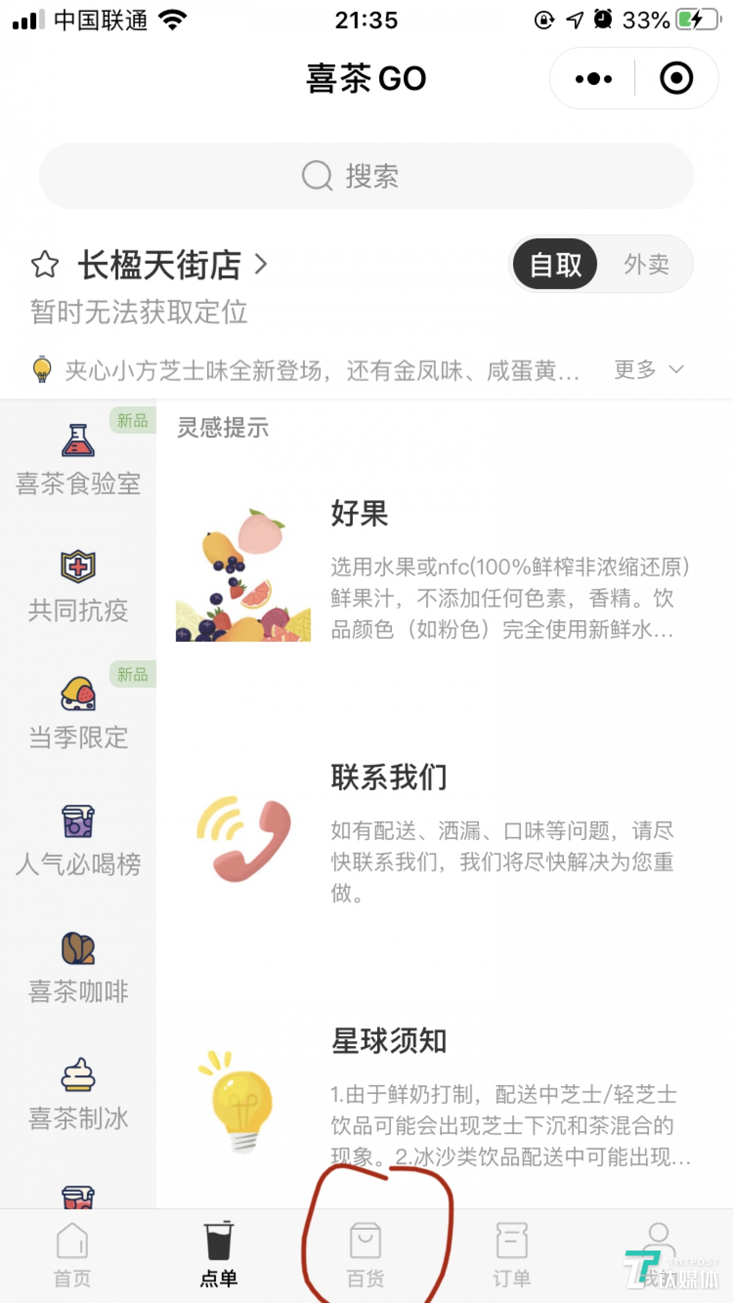 而如今「喜茶百货公司」也已完全并入「喜茶Go」小程序底部菜单栏中央的「百货」入口。