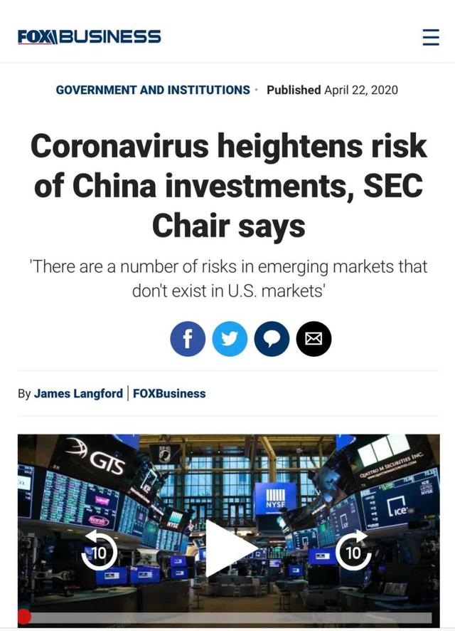 - 《美国SEC主席警告:不要将资金投入在美国上市的中国公司股票!》和讯网 2020年4月